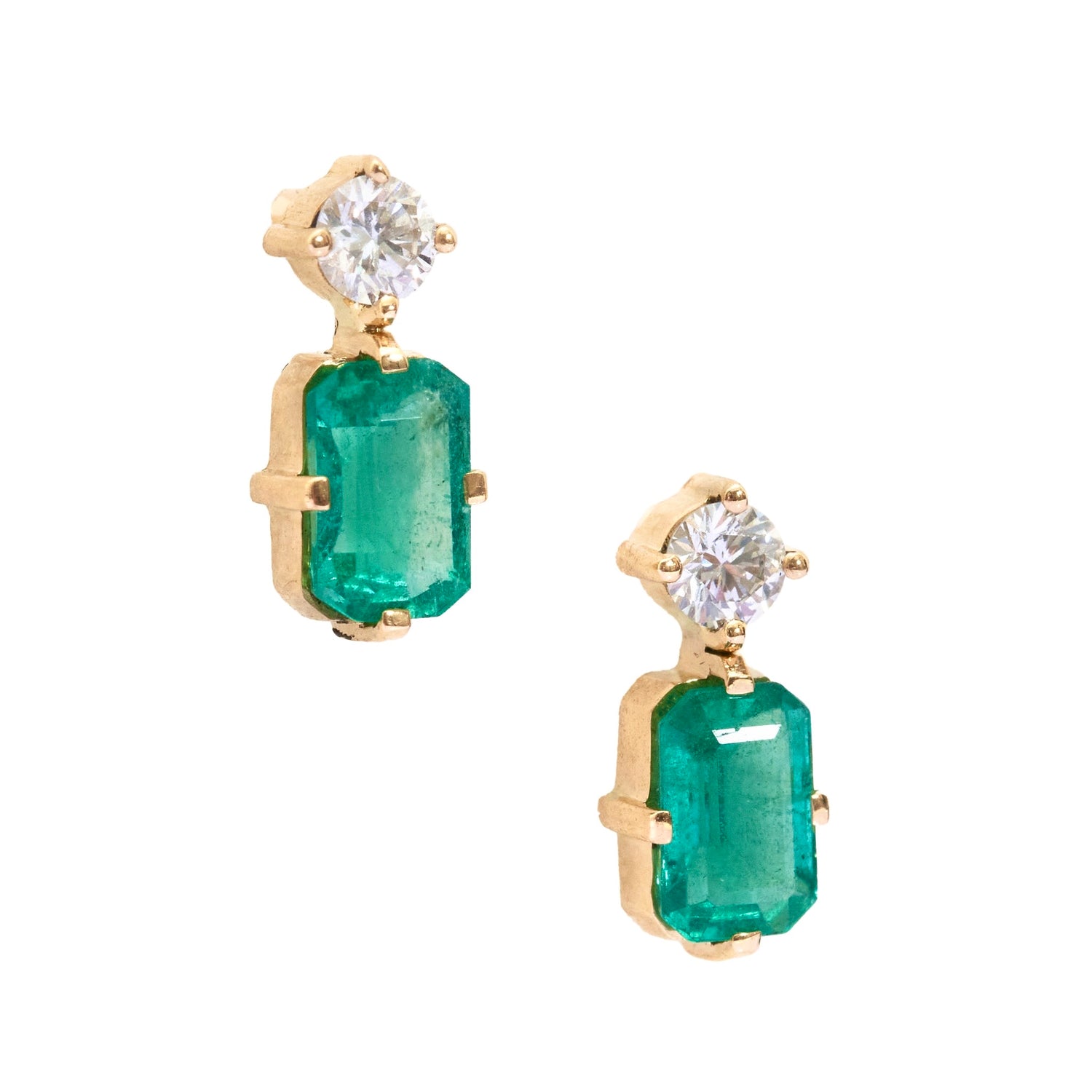 These chic earrings are the perfect everyday essential. You can never go wrong with diamonds and emeralds. This special pair is entirely handmade with unique square prongs which hug each emerald delicately in place. Dazzling brilliant cut 3mm diamonds sit atop spectacular Gemfields emeralds. Gemfields is the world leader in sustainable emerald mining.