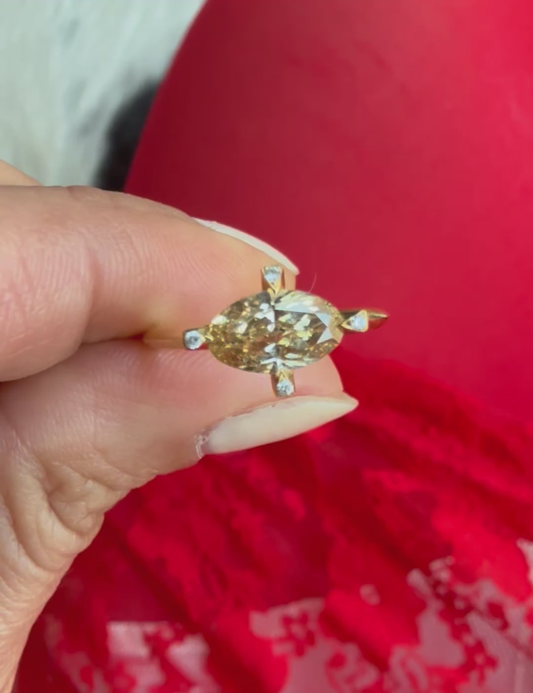 This champagne diamond appears larger than her carat weight. This mesmerizing diamond has a very large table and the oval shape make her seem even bigger. What is truly unique about this gem is that she has slight orange colorations. She plays the chameleon as her color changes in different light. She’s truly one in a million.