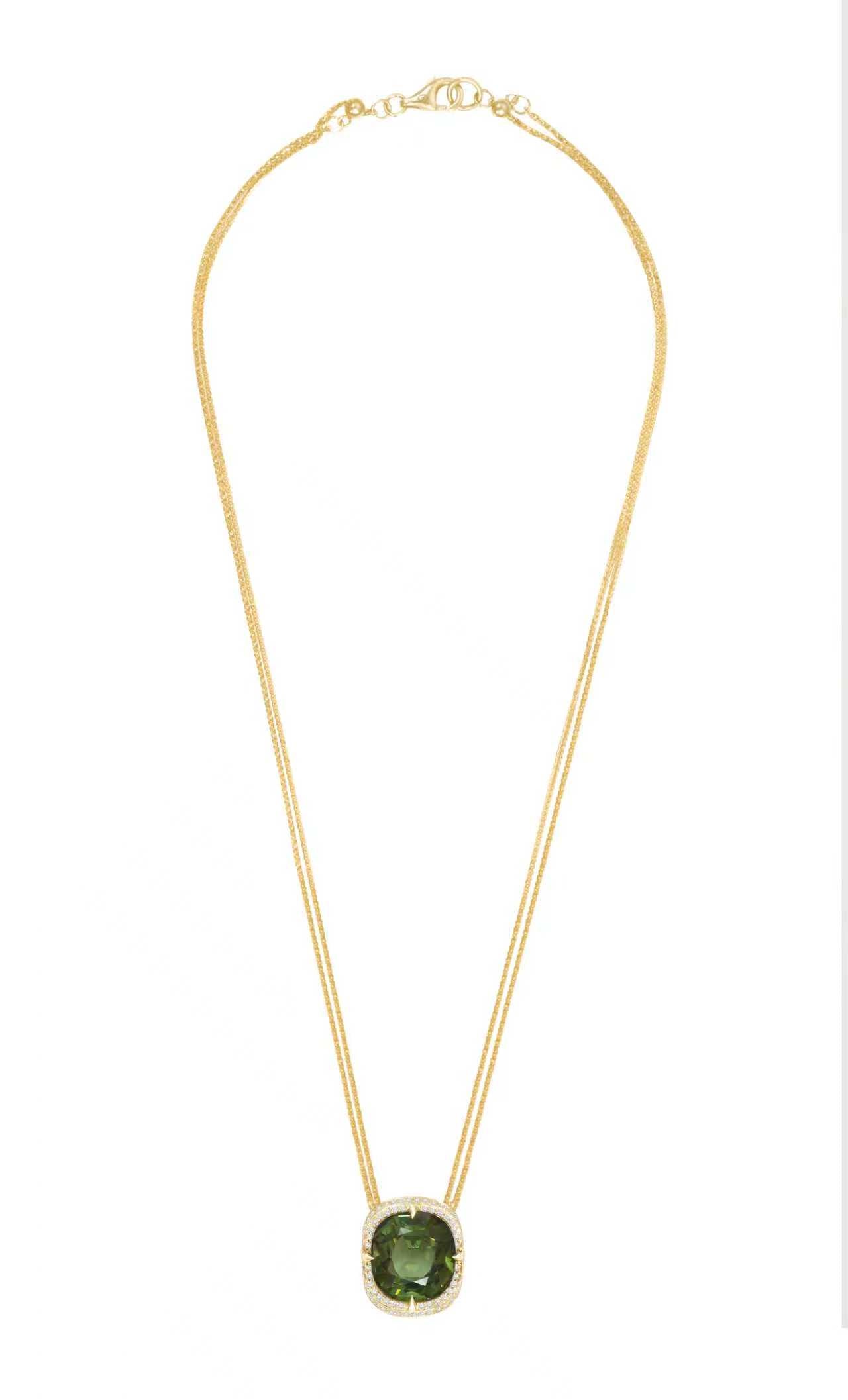 Green tourmalines connects directly to the heart chakra, lending her wearer the energy of strength and self love. This special piece is entirely handmade by our master goldsmith in 18k. The pendant is suspended from two necklaces which are adjustable. This means you can wear her as a choker or a much longer necklace.