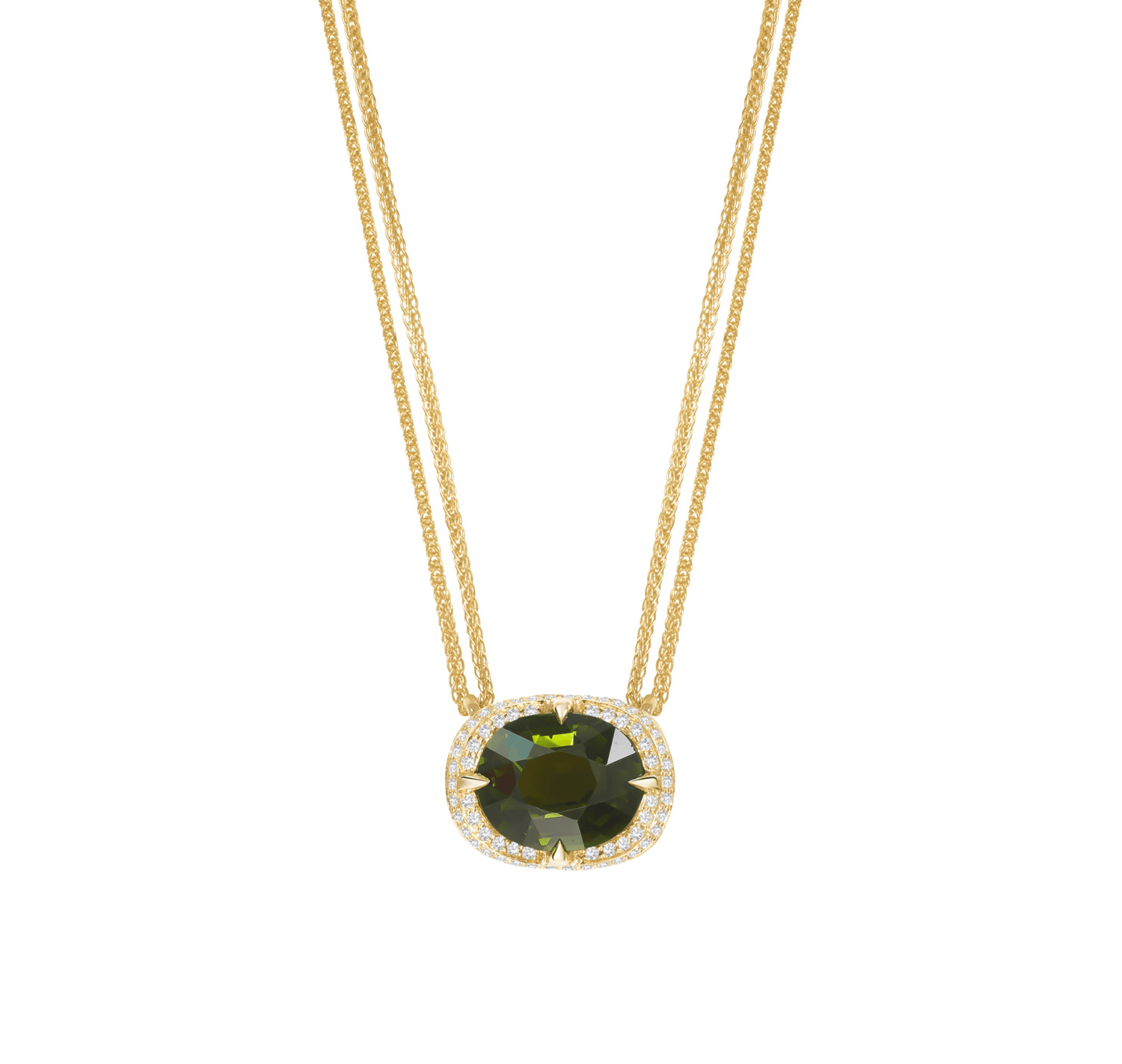 Green tourmalines connects directly to the heart chakra, lending her wearer the energy of strength and self love. This special piece is entirely handmade by our master goldsmith in 18k. The pendant is suspended from two necklaces which are adjustable. This means you can wear her as a choker or a much longer necklace.