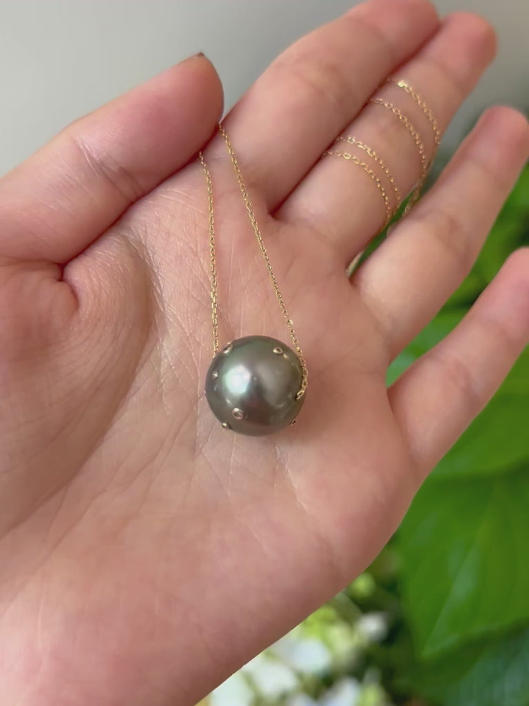 The large 12mm Tahitian pearl seems to be floating our signature diamond cut chain. The color and luster of our Tahitian pearl is of the best quality. It exudes the colors of a peacock feather. The light plays beautifully on this natural gemstone’s colors. It is not just a piece for the summer but a treasure for everyday.