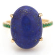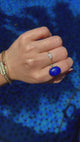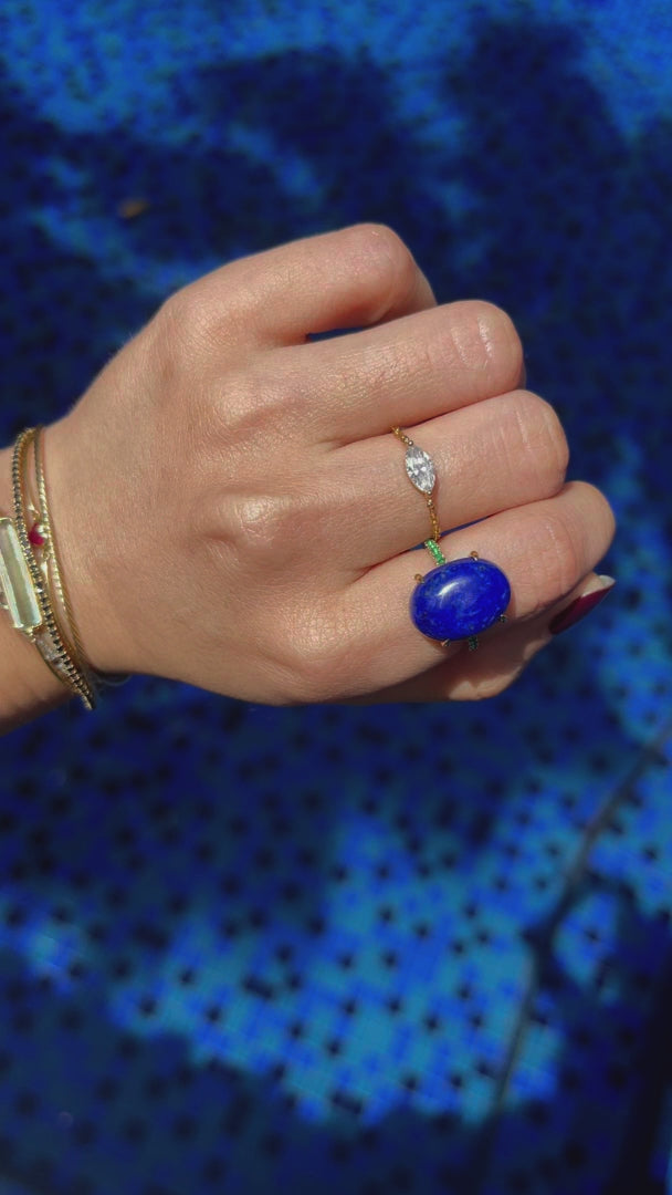 Lapis brings harmony to friendships and brings love and protection to relationships. Our nearly 10 carat lapis is set with a band of emeralds for a wonderful contract of color. Handmade in durable 9k gold, our capsule globe ring collection is a great conversation starter. Wear her as a statement cocktail ring or a fun daily ring.