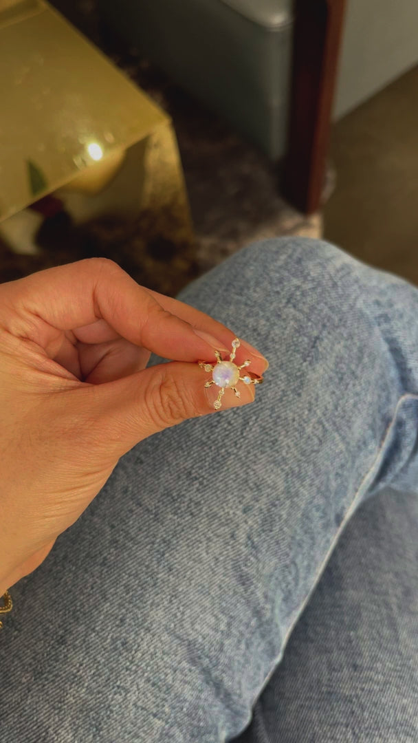 Our magical rainbow moonstone and diamond starburst ring will captivate your heart. This mystical moonstone brings balance, hope and compassion. We’ve designed this ring to wrap around your finger with a fun burst of gemstones. It’s a show stopping piece.