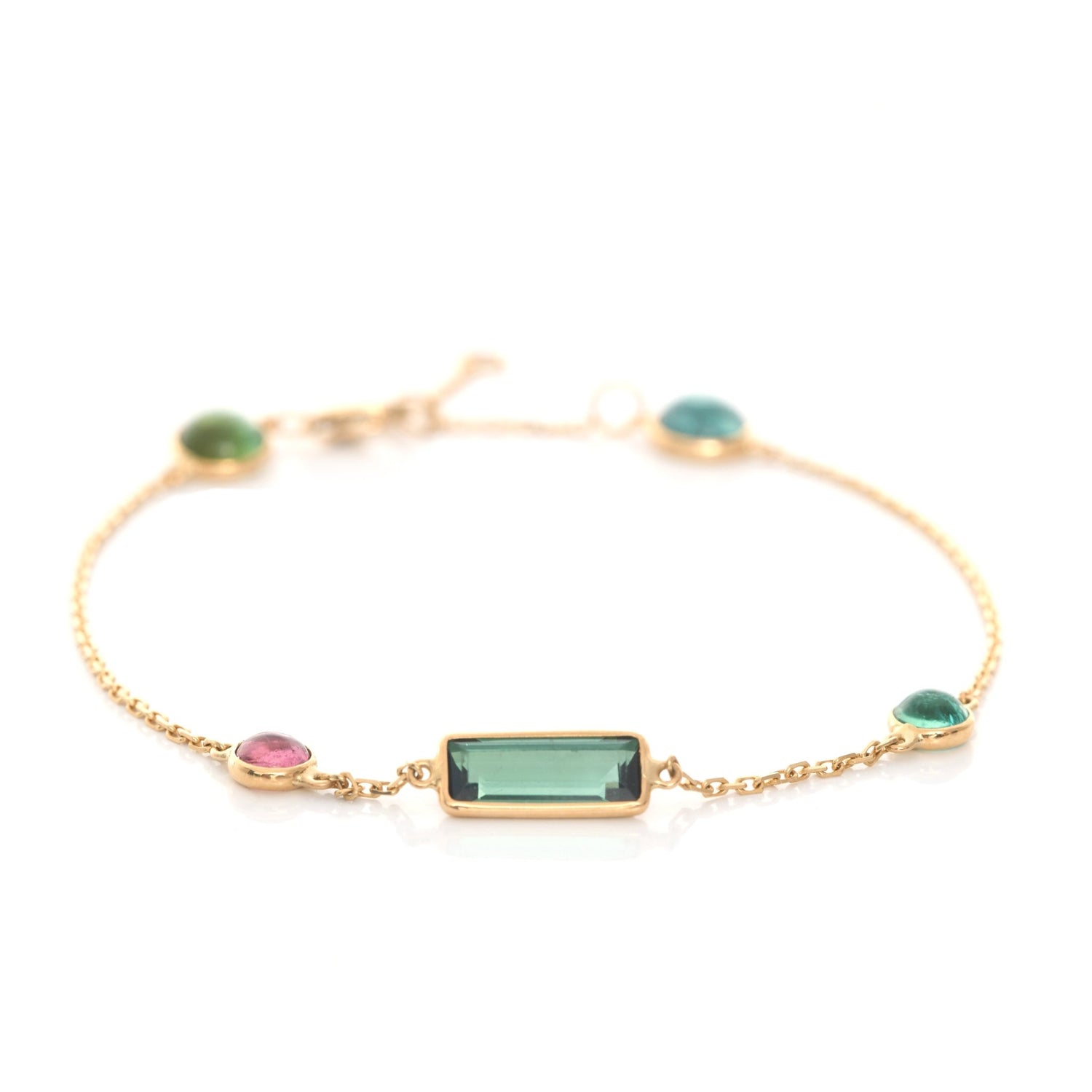 Masterly handmade in 18k gold. This bracelet has an elongated central green tourmaline with a sprinkling of rarer colored tourmalines. A selection of rubellites and indicolites are also showcased. This piece is not short on gemstones.