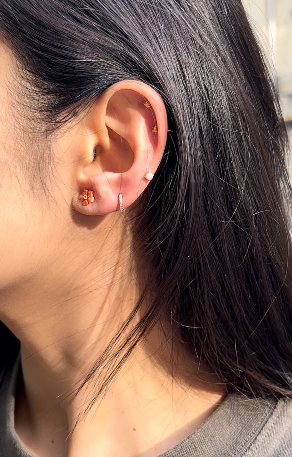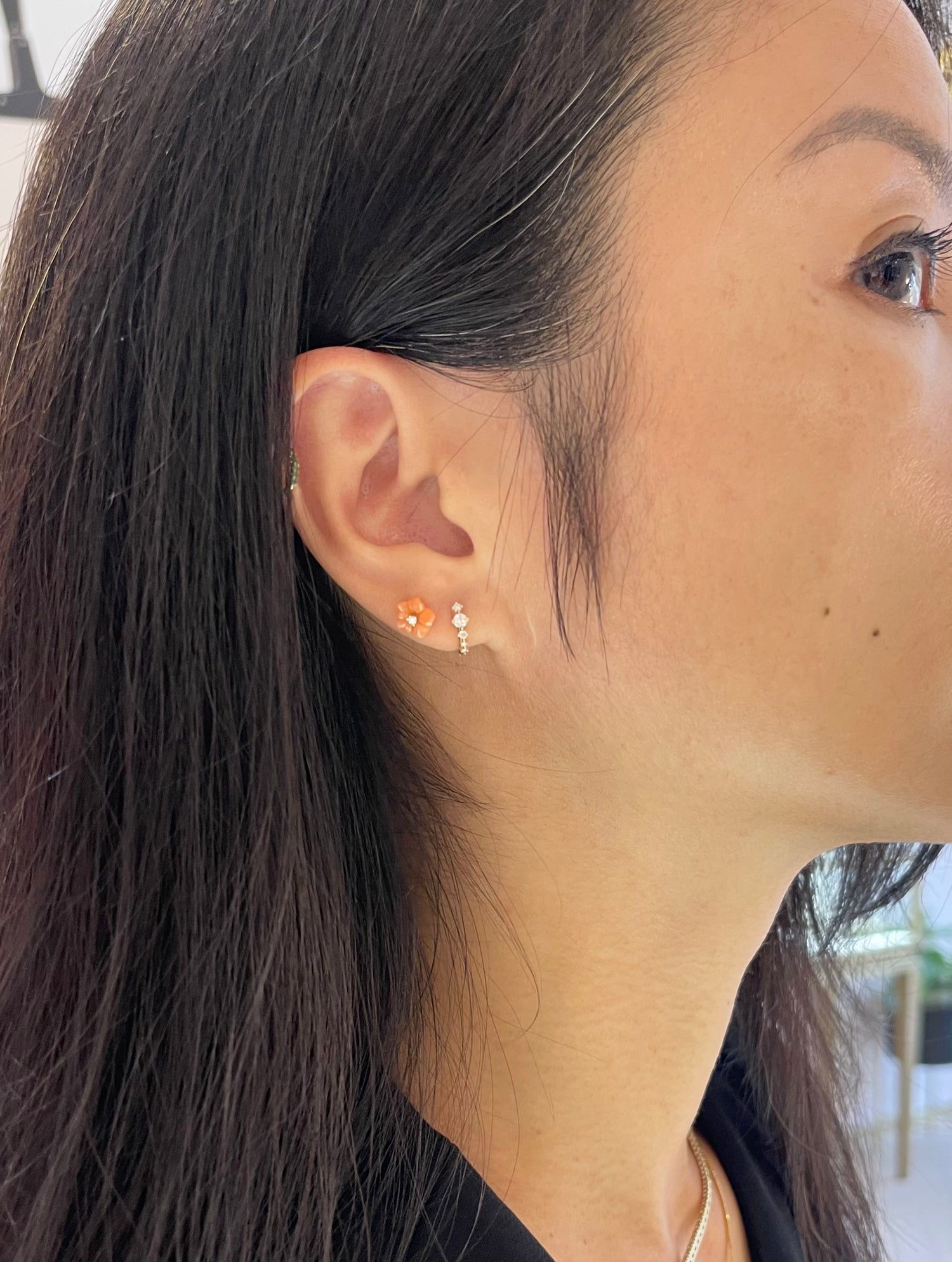These dainty hand carved coral flowers are all unique. Each is made entirely by hand with a diamond center. These sweet earrings will lighten up any ear stack.
