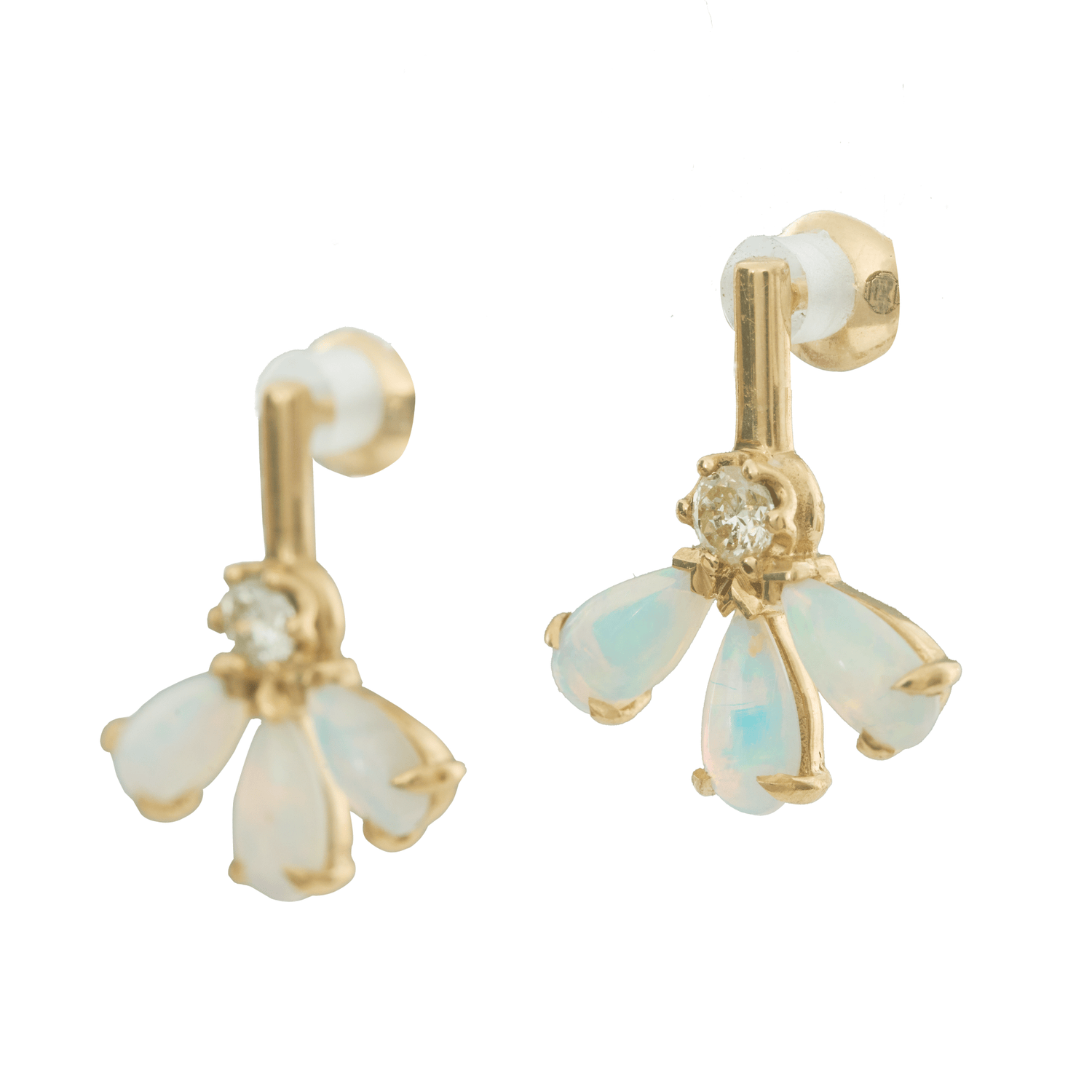 These incredibly special earrings are part of a mini collection of flora & fauna. We selected Australian opals for the body of these earrings. Australian Lightning Ridge opals are world renowned for their fire and color play within each gemstone. There seems to be a rainbow of electric colors trapped inside each of these pear shaped gems. The rarest color displayed in opals is red and these all have flashes of red.