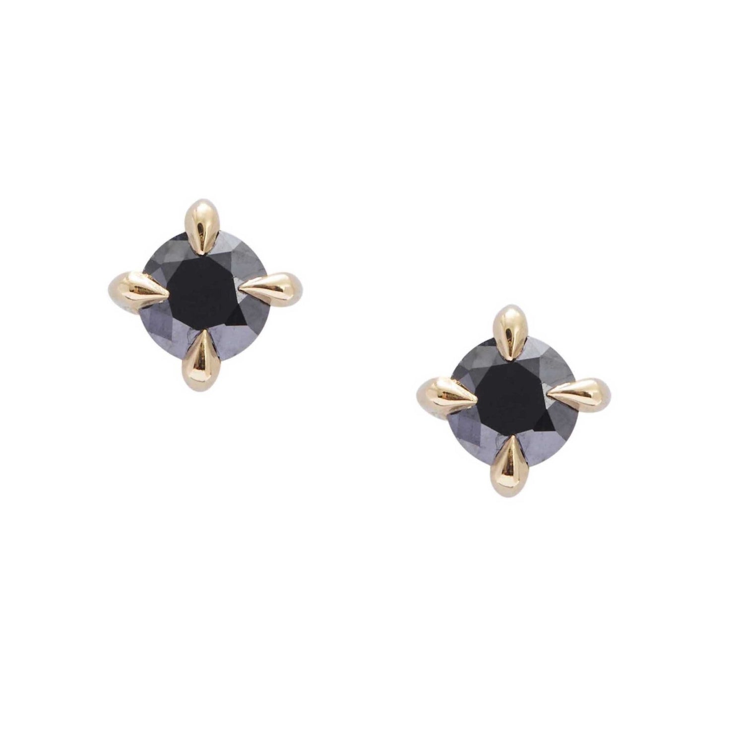 This pair of stunners are truly a dark horse. These black diamonds are set in our hand forged 14k gold. Eagle prongs set the gems in place with a cool edge. They compliment any outfit on any occasion.