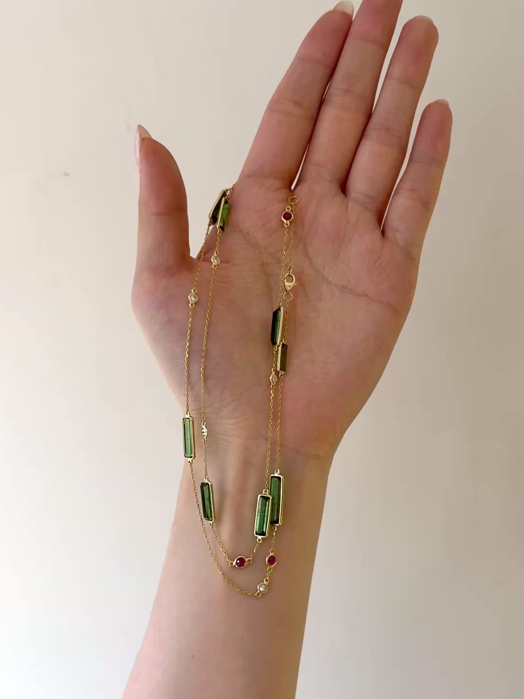 A wonderfully modern and versatile one-of-a-kind gemstone necklace featuring an array of elongated green tourmalines, rubies and diamonds. The combination is chic and unexpected. She is wonderful at anchoring any necklace stack.