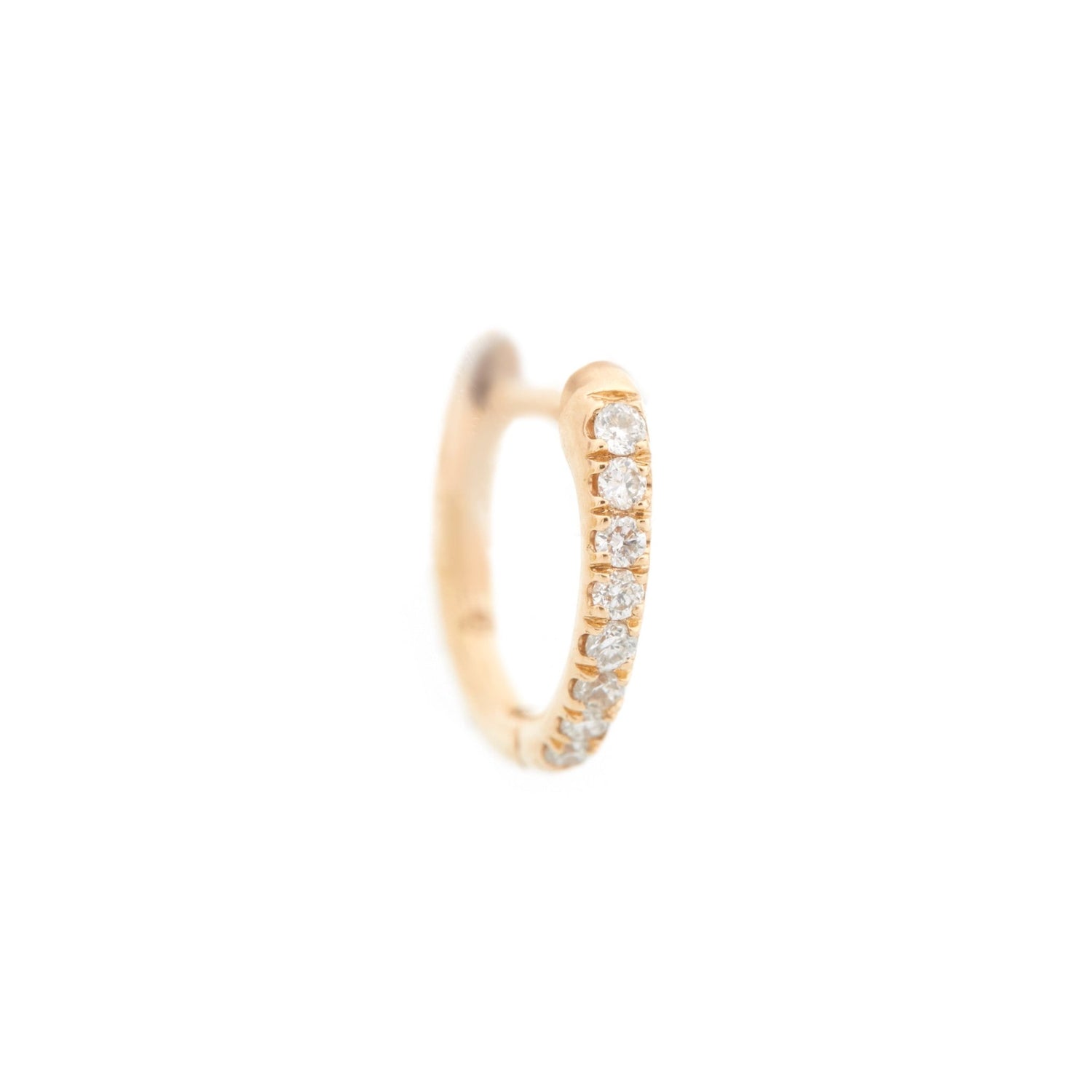 Our mini hoop is chic and versatile. It is made with eight 1mm brilliant cut diamonds. This wonderful earring looks perfect by herself in any ear stack. Additional charms can be purchased to elevate the look.