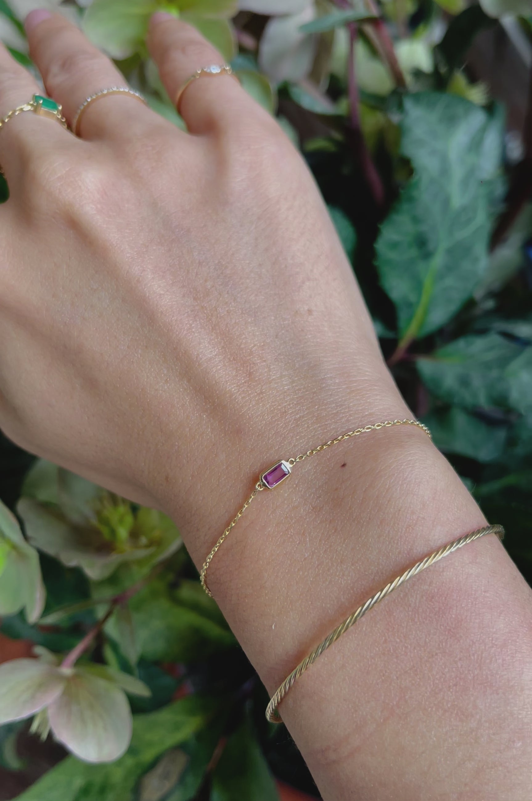 This pink Sapphire bracelet is feminine and modern. It's a perfect addition to any jewelry collection. A chic emerald cut pink sapphire stars as the central gem white a princes cut gem finished off the bracelet. These beautiful gemstones make this bracelet attractive from all angles.