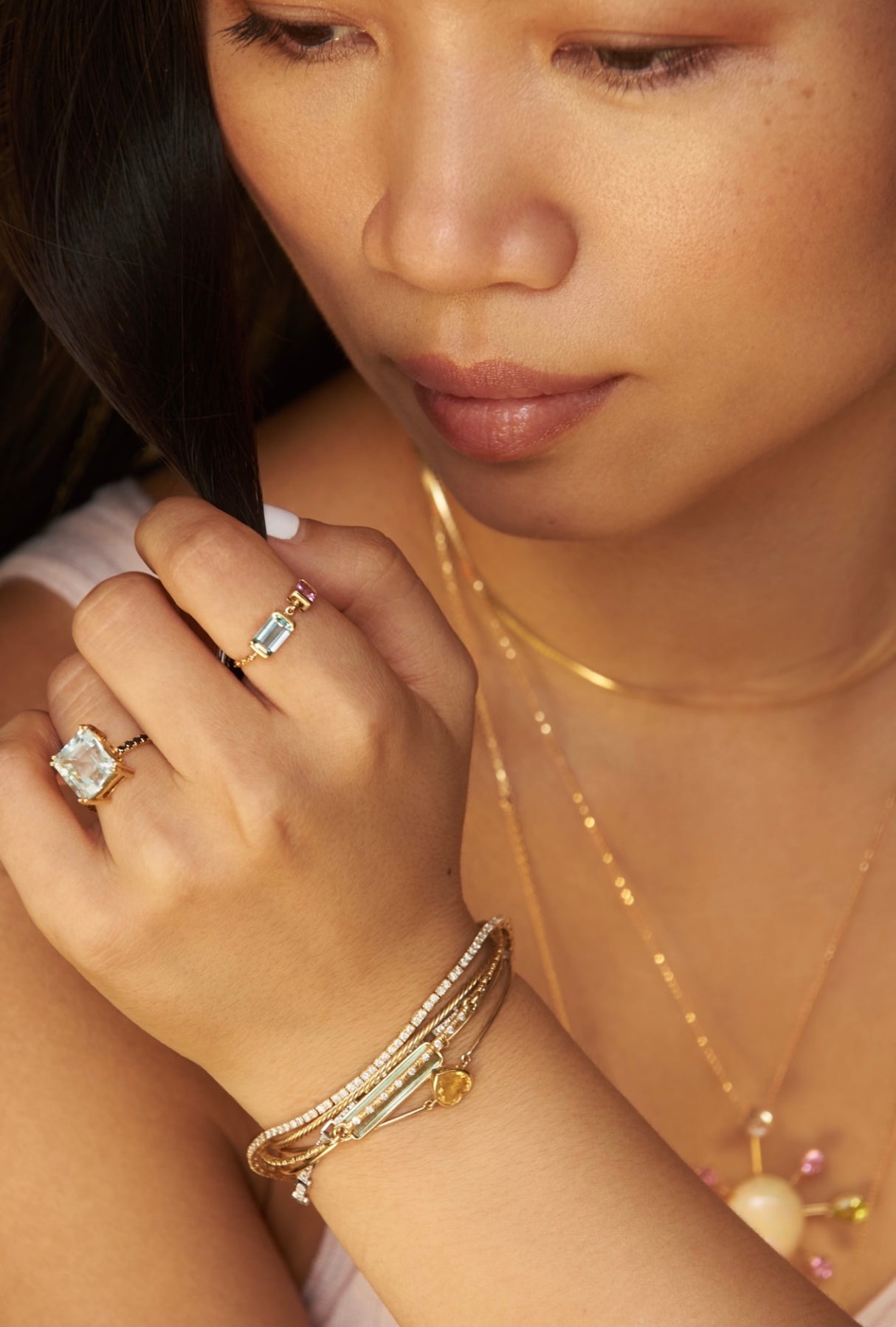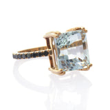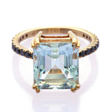 Our specialty cut asscher aquamarine has the depth of the sea. This deeply faceted gemstone reflects more light and hence seems to shine brighter than most aquamarines. This ring is paired with chic and modern black diamonds.