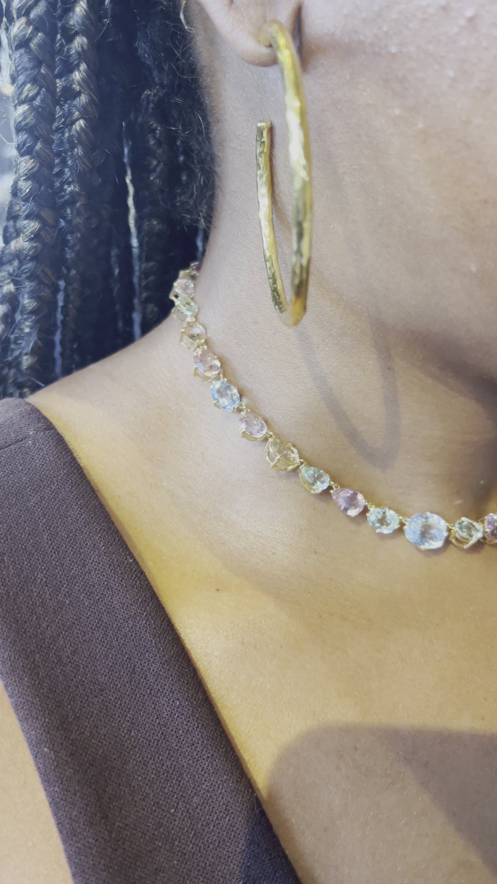 This exceptional necklace is a refreshing take on fine jewelry. A fun and playful combination of aquamarines and candy colored tourmalines come together in this one-of-a-kind creation. When you look closely, you’ll notice the that not all the stones are of the same shape but they compliment each other wonderfully.