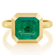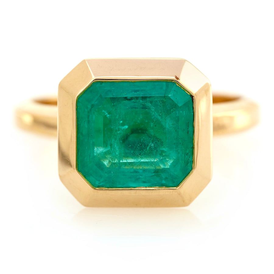 This graphic and linear ring is simply spectacular. A dazzling emerald of enviable size is bezel set to perfection in 18k gold. The cool lines of this ring allows for the central emerald to shine through. Each of our emeralds have been meticulously hand-selected. This is a prime example of how lustrous and fiery an emerald can be.
