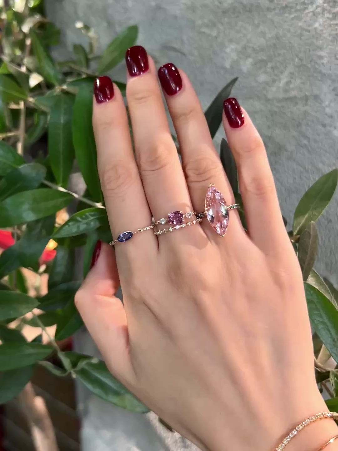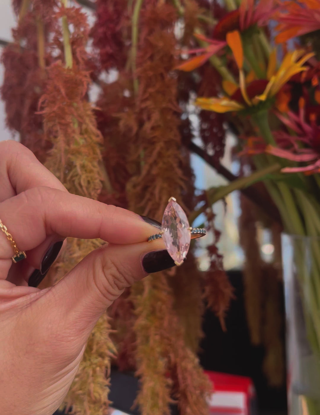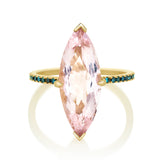 This ring is captivating with modern proportions. Over 3 carats of Morganite takes center stage, masterly cut for optimal brilliance. Its peachy-pink color is everything a fine morganite should be. The slender blue Diamond band contributes even more to its spark. This ring is stunning from any angle.