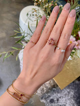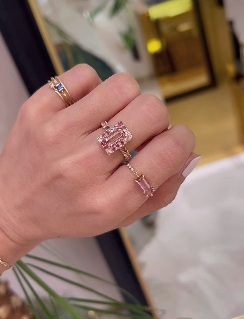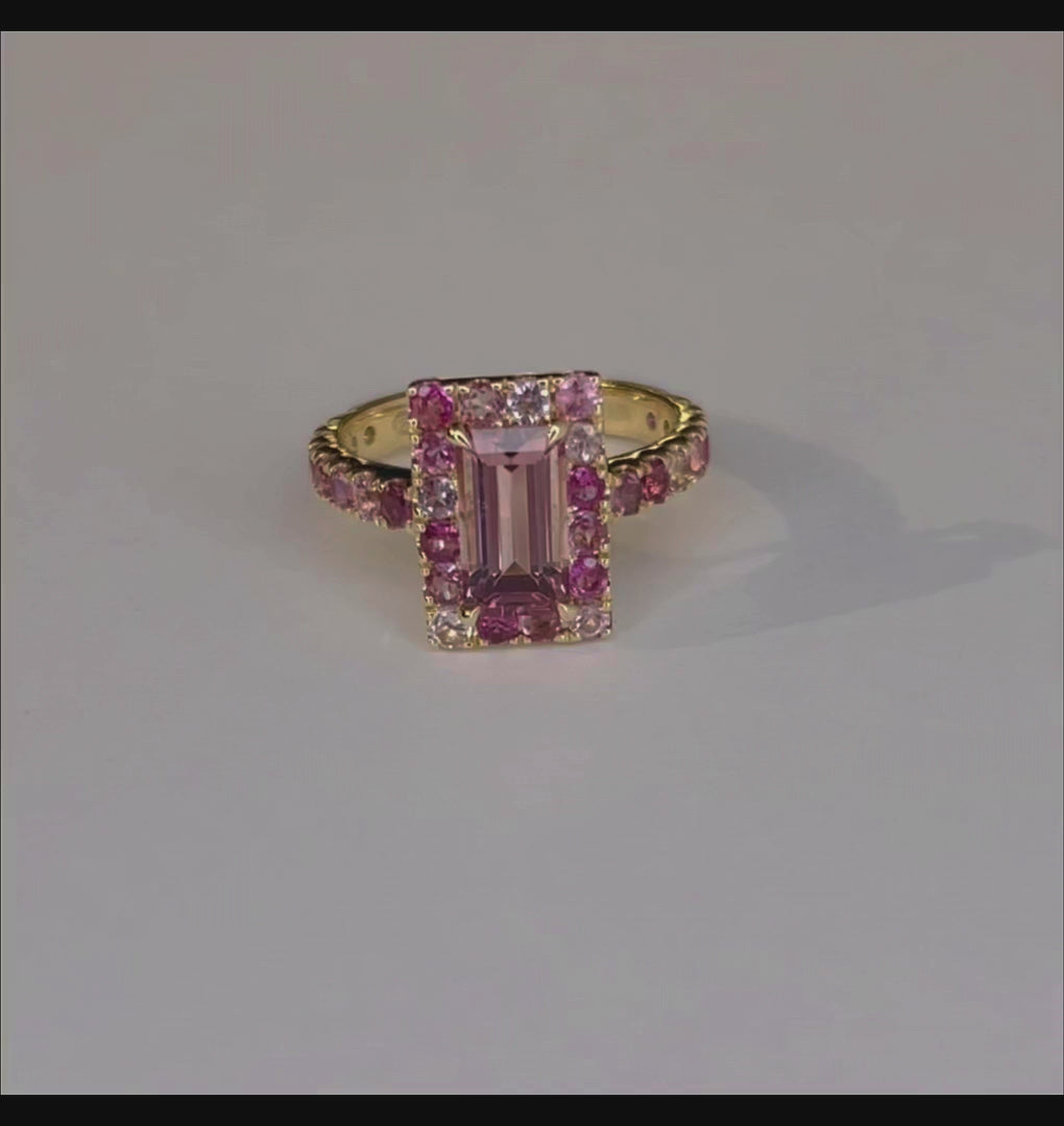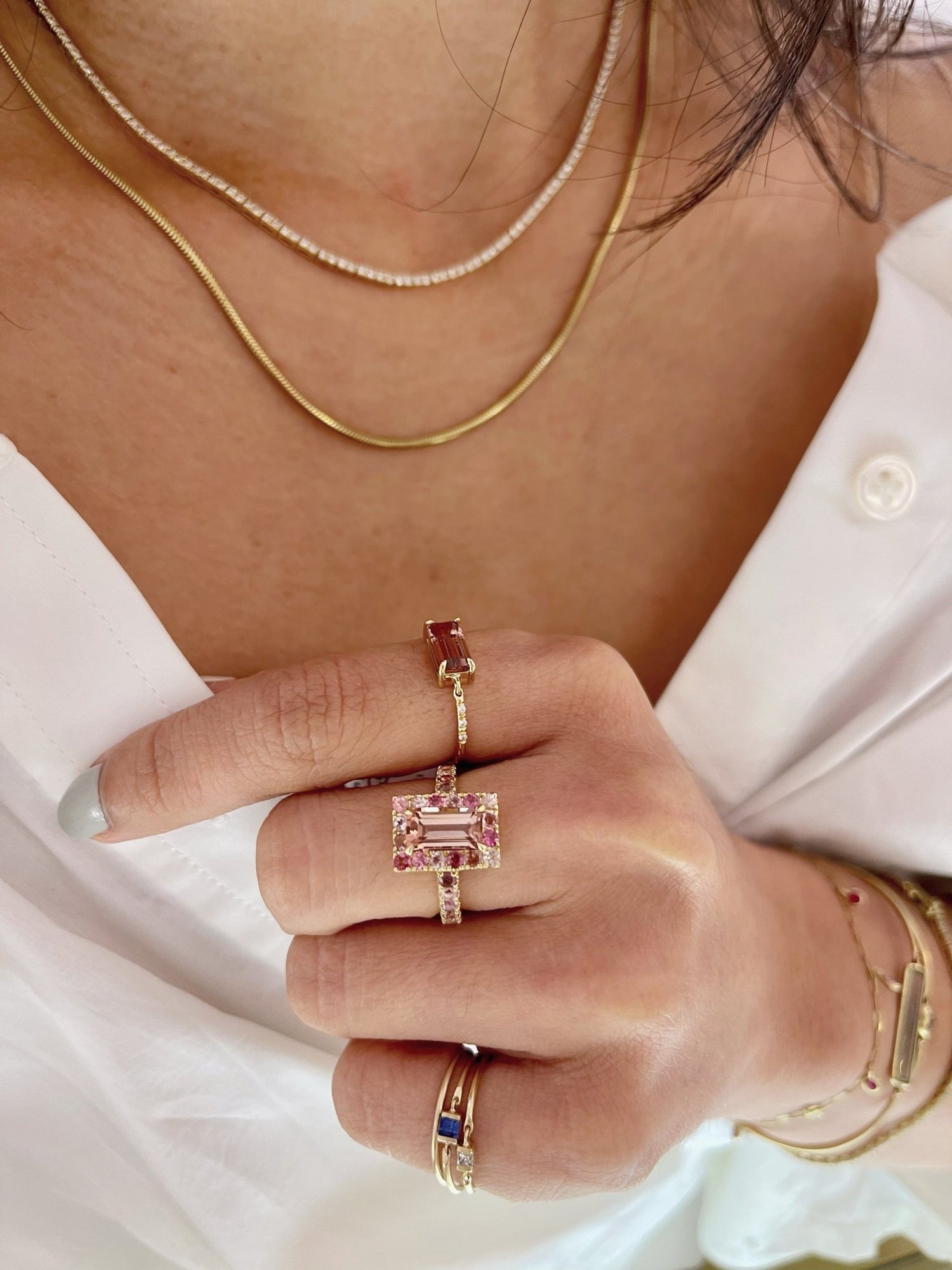 This pink Tourmaline is so perfectly girly.  These wonderful natural tourmalines are wonderfully displayed in an array of pink hues.  A frame of 2mm hand-selected multi colored pink gems surrounded the central baguette cut gem. Please note that this is a unique piece and so there will be variations of the pink hue. Each is custom made with hand-selected stones.