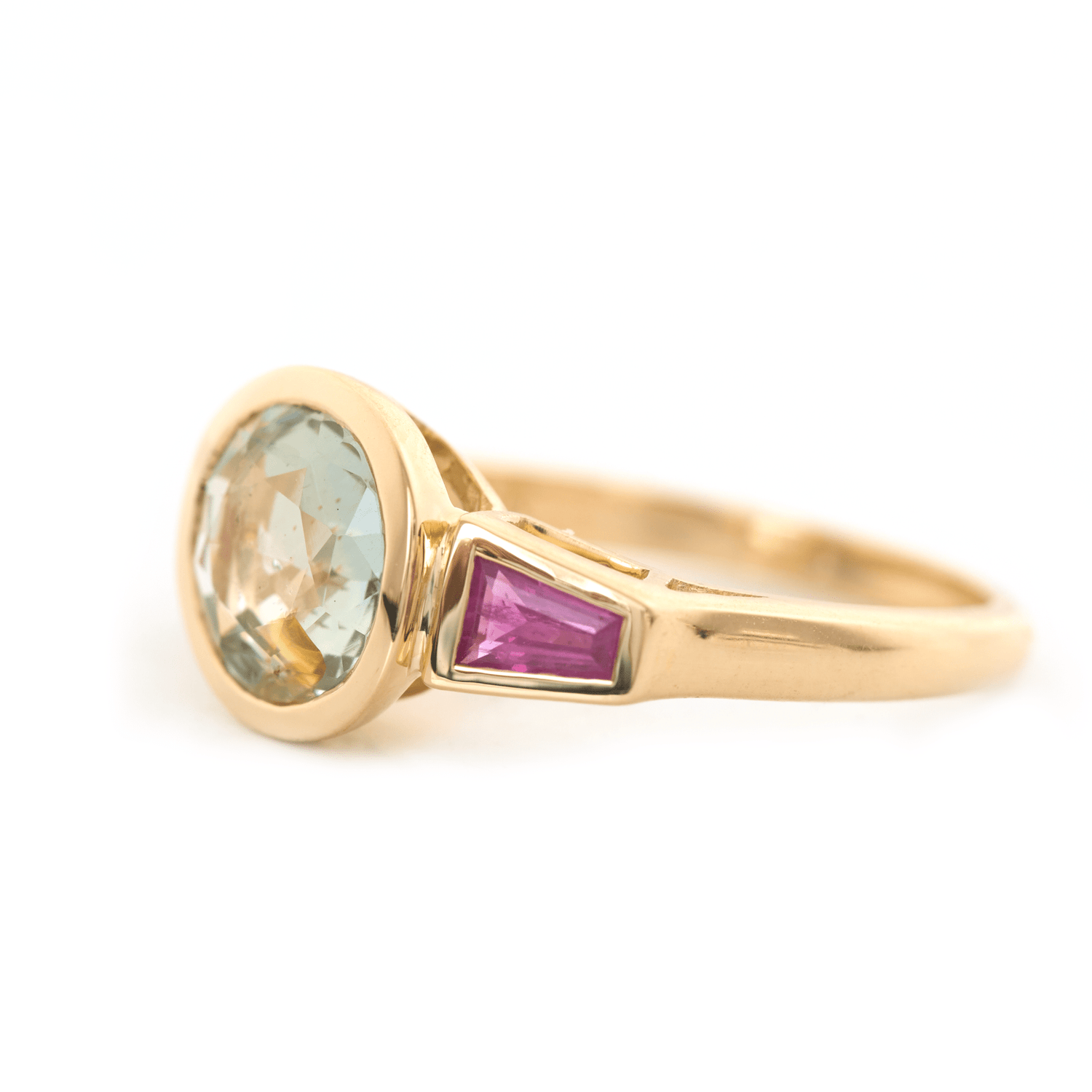 All three stones rest in smooth bezel settings, creating a sculptural, low-profile silhouette that sits beautifully on the hand. The solid 18k gold architecture frames each gem with clean geometric intention, letting the colour story unfold without distraction.