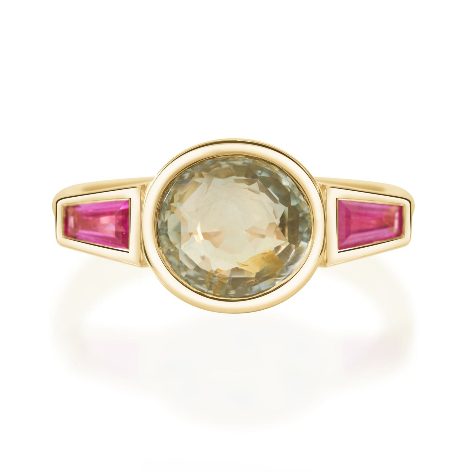 Flanking her on each side, a pair of natural rubies cut into tapered baguettes introduce a vivid streak of fuchsia that lifts the entire composition. The pairing is unexpected and refined, earthy softness meeting bold warmth, quiet luxury meeting confident colour.