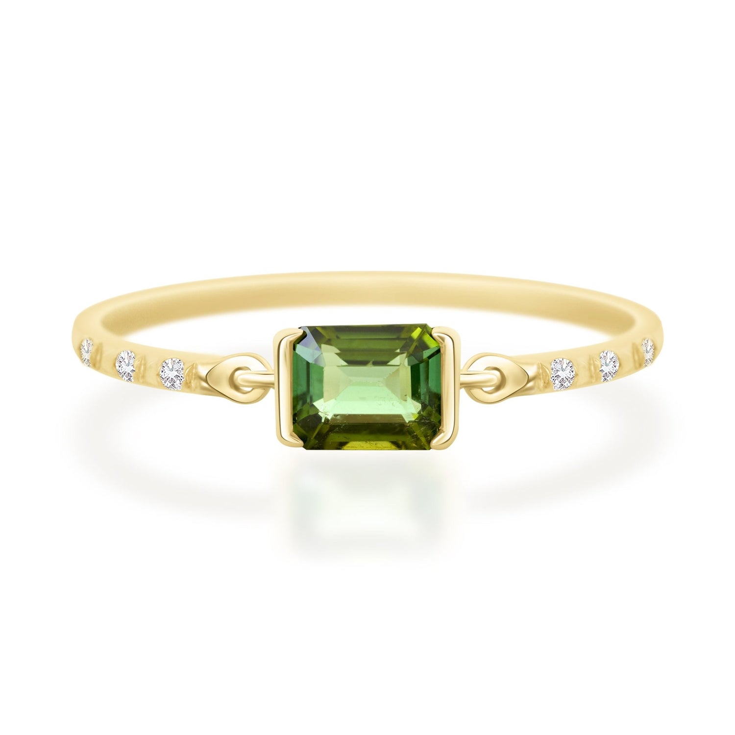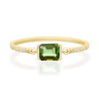 She shifts from forest green to golden yellow depending on the light, a mesmerizing color change tourmaline with the kind of personality you can’t look away from. The star in this ring is a natural, untreated emerald-cut green tourmaline, channel-set in solid gold and framed by our signature modern design of flush-set diamonds along the band.
