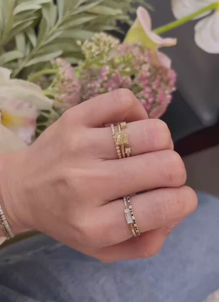 A wonderfully chic and modern ring. This magical canary diamond is bezel set with dazzling pave prongs. Yellow diamonds are among the rarest of all gems known to man. Her strength is only surpassed by her beauty. She exudes a cool nonchalant attitude. Seemingly simple yet wonderfully sophisticated in her details.